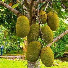 Jackfruit is the largest tree-borne fruit in the world, reaching 80 pounds in weight and up to 36 inches long and 20 inches in diameter. The outside of the compound fruit is green or yellow when ripe. The inside consists of large edible bulbs of yellow, banana-flavored flesh that encloses a smooth, oval, light-brown seed. The seed is 3/4 to 1-1/2 inches long and 1/2 to 3/4 inches thick and is white and crisp within. There may be 100 or up to 500 seeds in a single fruit, which are viable for no more than three or four days. When fully ripe, the unopened jackfruit emits a strong disagreeable odor, resembling that of decayed onions, while the pulp of the opened fruit smells of pineapple and banana.
