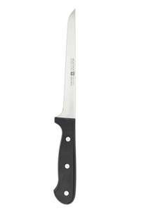 Boning Knife–A boning knife is a type of kitchen knife with a sharp point and narrow blade. It is used in food preparation for removing the bones of poultry, meat, and fish. Generally 5 to 6 ½-inches in length, it features a very narrow blade. Boning knives are not as “thick†as some of other popular kitchen/butcher knives, as this makes precision boning, especially in deep cuts and holes, much less difficult. A stiff boning knife is good for boning beef and pork, while a very flexible boning knife is preferred for poultry and fish.