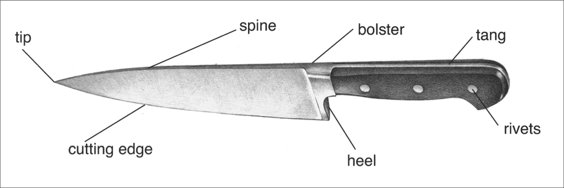Heel–The heel is the rear portion of the blade and is most often used to cut thick or tough products where more force is required.