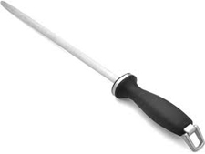 Honing or steeling, simply straightens a sharp edge and is performed immediately with each use of a knife. A steel is used to hone a blade and may be of steel, ceramic or diamond coated steel. Steels made of ceramic or diamond-coated steel do remove some metal.- It is important to clean your knife’s blade after honing (or sharpening) to remove any metal fragments that may be on the blade.